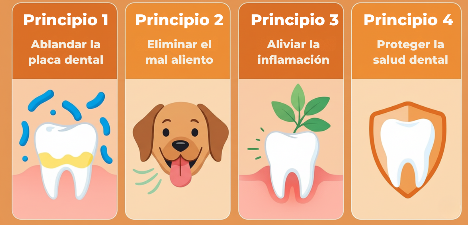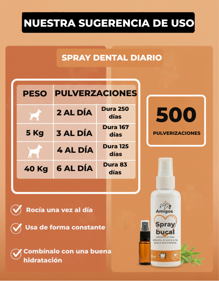 Nuestro espray se aplica en la comida de tu mascota o directamente sobre sus dientes. ¡Adiós al tedioso cepillado de dientes!